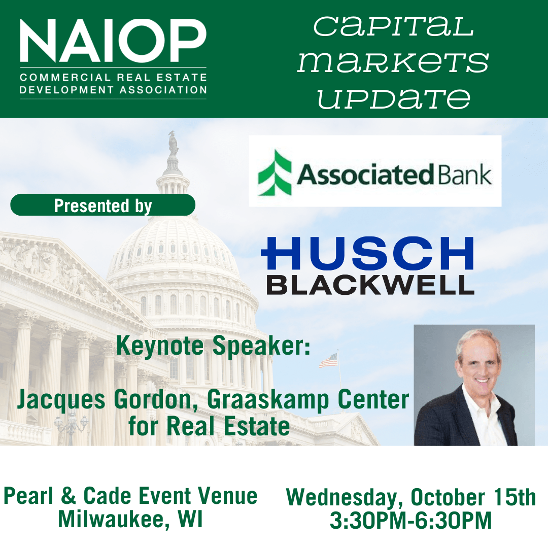 NAIOP Wisconsin, along with Associated Bank and Husch Blackwell are pleased to present the 2025 Capital Markets Update. This year's program will include a keynote address by Jacques Gordon, Director of the Graaskamp Center for Real Estate. Mr. Gordon will also join our VIP dinner after the event.