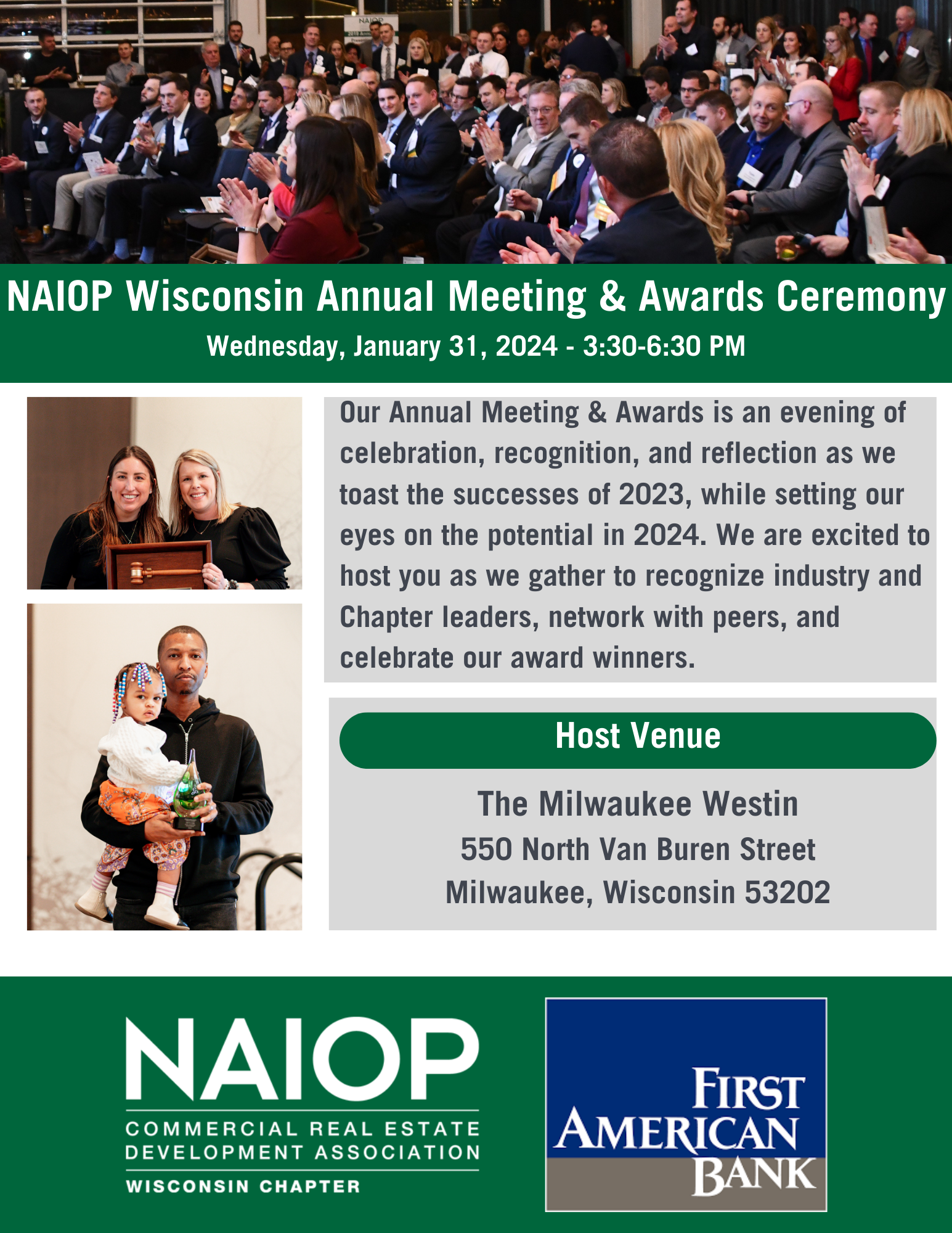 DESCRIPTION:Join us for our 2024 NAIOP Wisconsin Annual Meeting & Awards\, presented by First American Bank!Confirmed 2024 NAIOP Annual Sponsors\, please email Katie to reserve your complimentary tickets.2024 NAIOP Wisconsin AwardsPrincipal of the YearAssociate of the YearDeveloping Leader of the YearDevelopment of the YearMike Mooney AwardThrive AwardTrailblazer AwardVisit our website to learn more about the individual awards! Schedule of Events3:30PM   Check-In and Networking Reception4:00PM   NAIOP Wisconsin Awards4:30PM   NAIOP Wisconsin Annual Meeting5:00PM   Networking Reception6:30PM   Event Concludes